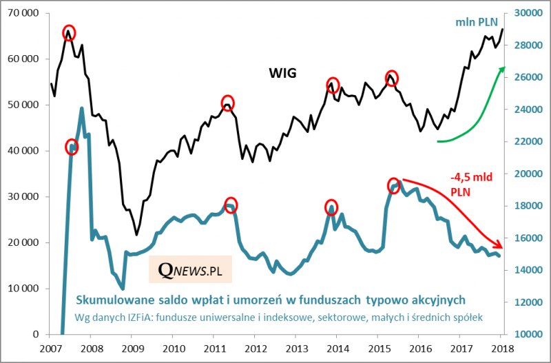 Atak WIG-u na ubiegłoroczne maksimum zbiegł się w czasie z publikacją najnowszych danych IZFiA na temat nabyć i umorzeń w polskich funduszach inwestycyjnych. Grudzień nie przyniósł przełomu - z funduszy typowo akcyjnych znów wycofywano pieniądze (saldo nabyć i umorzeń: -169 mln zł). Jak pokazujemy na wykresie, stopniowa ucieczka kapitałów z funduszy czysto akcyjnych trwa z krótkimi przerwami już od 2,5 roku, mimo że w tym samym czasie WIG wspina się na coraz wyższe pułapy. Ta "hossa bez napływów" to prawdziwy ewenement na tle historycznym (w pewnym stopniu uzasadnieniem jest panująca w poprzednich kilku latach moda na fundusze typu absolute return, ale i one notowały odpływy w 2017 r.).