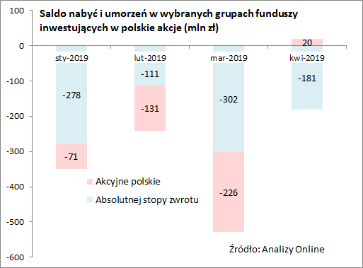 Kwiecień przyniósł w końcu dodatnie saldo nabyć w kategorii funduszy typowo akcyjnych (+20 mln zł netto), ale kapitał uciekał nadal z funduszy absolutnej stopy zwrotu, z których większość ma większe lub mniejsze pozycje w polskich akcjach.