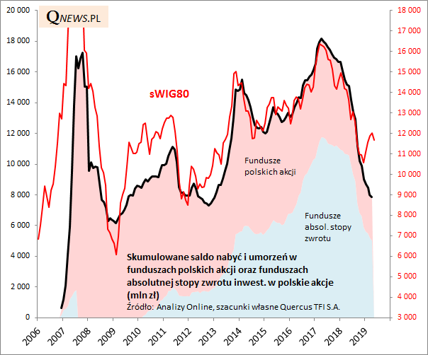 Na dłuższą metę suma nabyć i umorzeń w tych dwóch kategoriach funduszy jest silnie skorelowana z zachowaniem np. indeksu sWIG80. W szczególności szczyt popularności funduszy absolutnej stopy zwrotu pokrył się w czasie ze szczytem indeksu małych spółek (wiosna 2017).