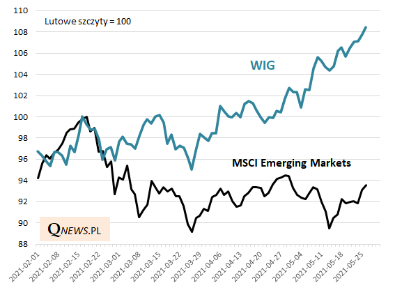 W ostatnich miesiącach - a szczególnie w maju - rodzimy rynek akcji nie przejmuje się zbytnio zadyszką na rynkach wschodzących. WIG na poziomach najwyższych od 2018 roku, a MSCI Emerging Markets w trendzie bocznym poniżej lutowej górki.