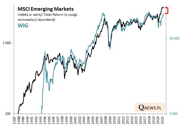 Czy oznacza to, że rodzimy indeks niebezpiecznie oderwał się od tradycyjnej więzi łączącej go z globalnym benchmarkiem? To chyba byłoby zbyt daleko idące stwierdzenie, bo chociaż krótkoterminowo WIG jest relatywnie mocniejszy, to z bardziej długoterminowej perspektywy okazuje się, że ciągle dopiero ... redukuje zaległości względem emerging markets. Zauważmy, że dochodowa wersja indeksu MSCI EM już w zeszłym roku pobiła historyczny rekord, podczas gdy WIG dopiero się do niego zbliża.