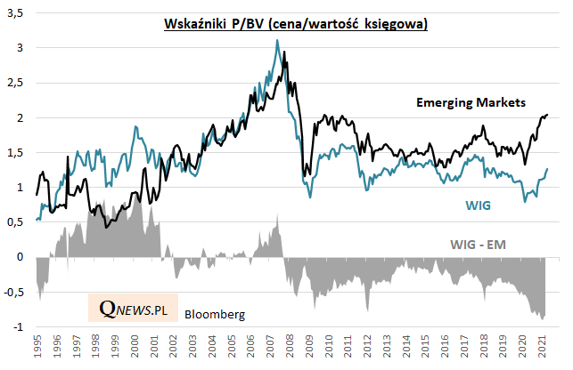 Zaległości, o których pisaliśmy wielokrotnie już w ubiegłym roku, widać ciągle również jeśli chodzi o wskaźniki wyceny takie jak cena do wartości księgowej. Dyskonto w wycenie polskich akcji dopiero zaczęło się zmniejszać z rekordowych rozmiarów.
