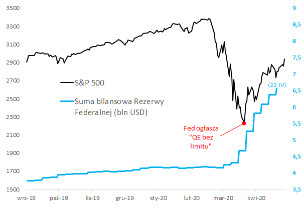 Bez wątpienia kluczową rolę w odreagowaniu odgrywają olbrzymie programy stymulacji monetarnej i fiskalnej na świecie. Amerykański Fed powiększa swą sumę bilansową w tempie dużo szybszym niż w trakcie którejkolwiek poprzedniej fazy QE. Warto zauważyć, że marcowy dołek na giełdach miał miejsce praktycznie dokładnie w momencie, gdy Fed ogłosił „QE bez limitów”.