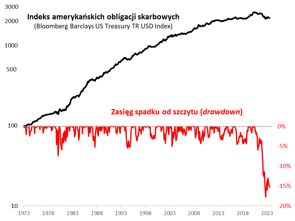 W tej sytuacji za jedyny sukces uznać można zatrzymanie wcześniejszej bessy na rynku amerykańskiego długu. O ile w najgorszym jej punkcie, w październiku 2022, wspomniany indeks był rekordowe 17,8 proc. poniżej szczytu, to po lipcu br. ten „drawdown”, posługując się angielskojęzyczną terminologią, wynosił -15 proc.