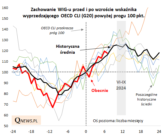 Reasumując, dalszy wzrost OECD-owskiego CLI sygnalizuje środowisko nadal sprzyjające krajowemu rynkowi akcji. Oczywiście po każdym kolejnym miesiącu wspinaczki tego wskaźnika przybliża się on do historycznych cyklicznych szczytów (jeden z nich już pokonał), po odnotowaniu których koniunktura zaczynała zakręcać w drugą stronę, ale na razie nie ma sygnałów, że jesteśmy już na tym niebezpiecznym etapie.