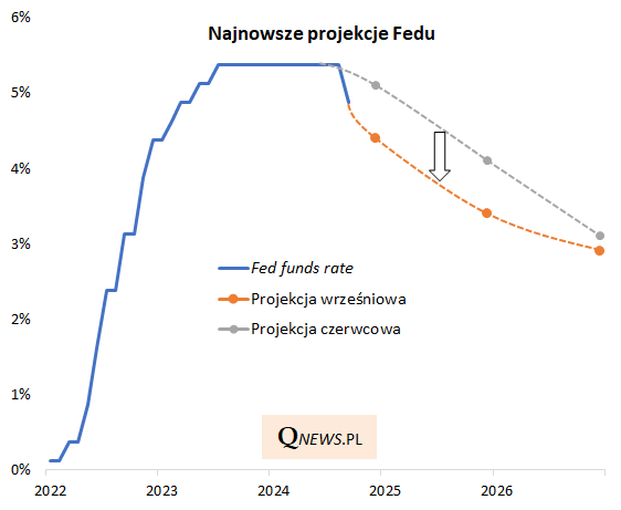Duża obniżka na początek to jeszcze nie wszystko. Członkowie władz monetarnych wyraźnie przesunęli też w dół swoje projekcje poziomu stóp na ten i przyszły rok. Do końca 2025 stopa Fedu ma zejść w dół jeszcze łącznie o 150 pb (już względem obecnego, obniżonego poziomu).