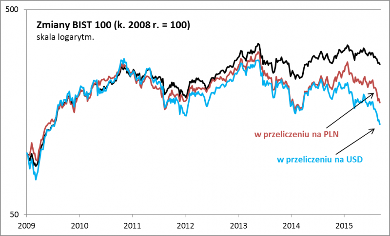 Sęk w tym, że dla inwestorów zagranicznych (w tym polskich) liczą się także zmiany kursu walutowego, a w przypadku liry są one wyjątkowo dynamiczne. Efekt jest taki, że w przeliczeniu na złote lub dolary wykres BIST 100 nie wygląda już tak "ładnie". "Złotówkowy" BIST 100 cofnął się ostatnio do poziomów najniższych od prawie półtora roku, a "dolarowy" - znalazł się najniżej od sześciu lat.
