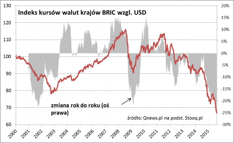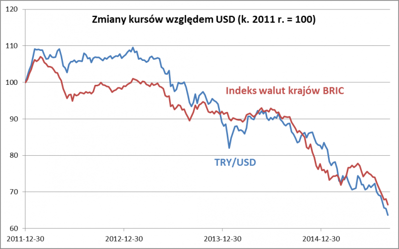 Jednym z powodów osłabiania się liry są tradycyjnie przedłużające się zawirowania polityczne (na listopad zaplanowano kolejne wybory parlamentarne po tym, jak partia AKP nie zdołała stworzyć koalicji rządowej; na dodatek Turcja została wciągnięta w konflikt zbrojny z islamistami z IS). Zjawisko to ma jednak także wymiar globalny - poniższy wykres dowodzi, że spadek notowań TRY jest ściśle związany z osłabieniem walut na innych rynkach wschodzących (BRIC = Brazylia, Rosja, Indie, Chiny).