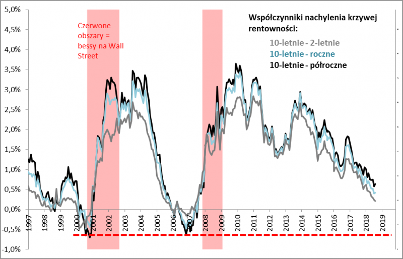 Przy okazji poprzedniej, czerwcowej podwyżki, jeszcze dokładniej zbadaliśmy temat odwrócenia krzywej rentowności obligacji skarbowych jako sprawdzonego prognostyka recesji. Doszliśmy wtedy do wniosku, że sygnałem do ewakuacji z Wall Street nie było w poprzednich dwóch cyklach ani samo spłaszczanie się krzywej rentowności (czyli sytuacja, w której zawęża się różnica między rentownościami długoterminowych i krótkoterminowych papierów skarbowych – z tym mamy do czynienia w ostatnich kilkunastu miesiącach), ani nawet odwrócenie krzywej (długoterminowe rentowności niższe od krótkoterminowych). Potrzebne było natomiast GŁĘBOKIE odwrócenie, które zdefiniowaliśmy jako sytuację, w której rentowność papierów 10-letnich jest o ponad 0,5 pkt. proc. NIŻSZA od rentowności papierów półrocznych.