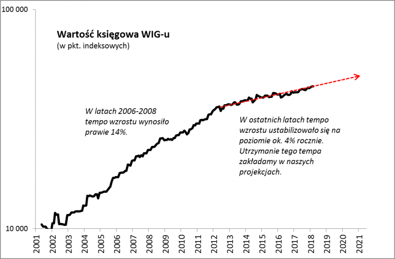 W tym miejscu dochodzimy do sedna omawianej projekcji. Jeśli założymy, że wartość księgowa WIG-u będzie nadal rosła w tempie 4 proc., to za trzy lata będzie na poziomie ok. 50.300 pkt. (wartość księgowa jest tu przeliczona na punkty indeksowe). Jeśli teraz pomnożymy ten rezultat przez wspomniane 1,3, to otrzymujemy ok. 65.400 pkt. – na tej wysokości powinien być za trzy lata WIG, jeśli spełnione będą wspomniane wcześniej założenia.