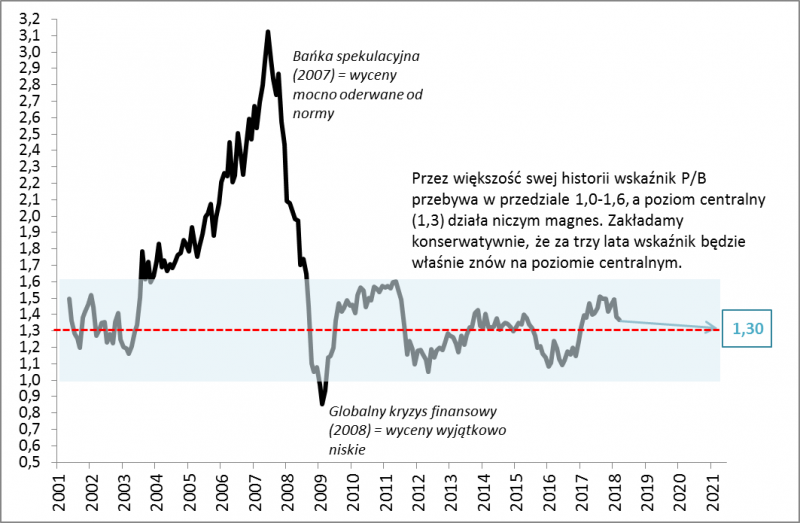 Hurraoptymistyczne projekcje mogłyby zakładać, że w którymś momencie wyceny powrócą do tamtych kosmicznych pułapów. My jednak wolimy pozostać przy dużo bardziej konserwatywnych założeniach. Zauważmy, że – jeśli nie liczyć anormalnego okresu lat 2004-2008 – to przez niemal całą pozostałą historię wskaźnik P/B przebywa w dość wąskim przedziale 1,0-1,6, z poziomem centralnym równym 1,3.