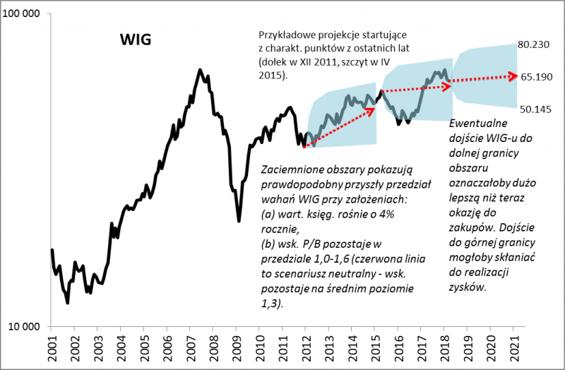 Przykładowe projekcje z przeszłości, które bazowałyby na tej metodologii, pokazują, że choć w ostatecznym rozrachunku WIG lądował mniej więcej tam, gdzie powinien, to po drodze potrafił wędrować w dół i w górę. Weźmy przykład startujący z lokalnego szczytu w kwietniu 2015. Wtedy projekcja mówiłaby, że za kolejne trzy lata (IV 2018) WIG powinien dotrzeć do ok. 59.000 pkt. z ówczesnych niespełna 57.000 pkt. I tak w zasadzie się stało. Ale po drodze indeks zaliczył głęboki spadek, szorując po dolnej granicy pasma prawdopodobnych wahań. Na skutek tego w tzw. międzyczasie nadarzyła się więc dużo lepsza okazja do dokonywania zakupów akcji. Kto wie czy i tym razem nie będziemy mieli do czynienia z podobną sytuacją.