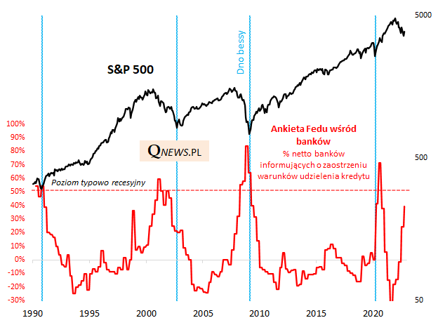 Reasumując, najnowsza ankieta Fedu wśród banków komercyjnych pokazuje dalsze zaostrzanie warunków udzielania kredytów, co jest z jednej strony typową reakcją na ciemniejące chmury nad gospodarką i rosnące stopy procentowe, a z drugiej może być zgodnie z tradycją prognostykiem recesji. W tej sytuacji relatywnie dobra wiadomość jest taka, że w trakcie tegorocznej bessy S&P 500 już w jakimś stopniu dyskontował te zjawiska.