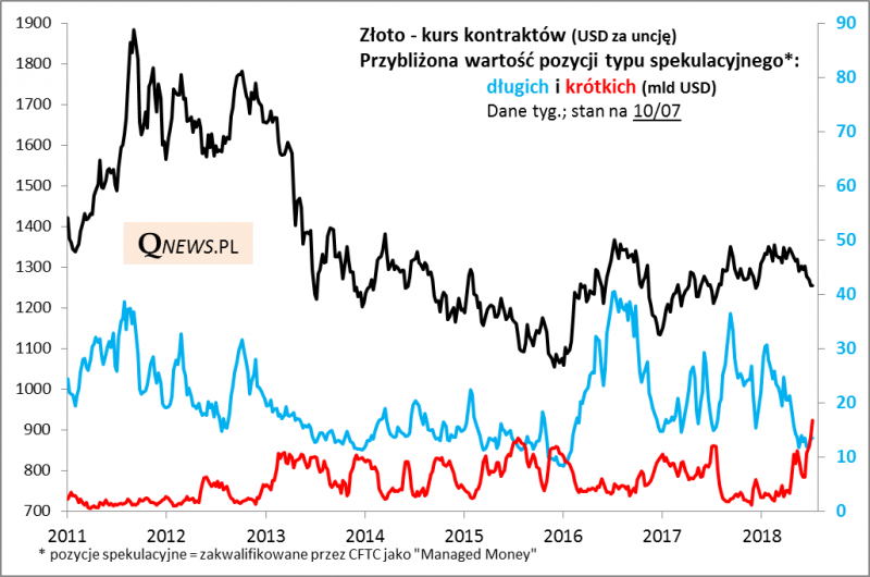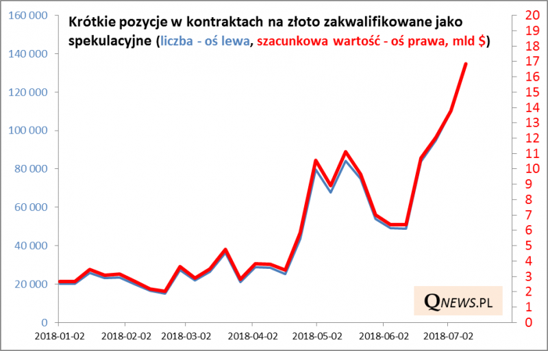 Spadek ceny szlachetnego metalu do poziomu najniższego od grudnia ub.r. wywołał silną reakcję traderów (głównie funduszy hedginowych), które zaczęły masowo otwierać krótkie pozycje w kontraktach na złoto (krótka pozycja pozwala zarabiać na spadku notowań). Z naszej analizy danych amerykańskiej komisji CFTC wynika, że krótkie pozycje osiągnęły rekordowe rozmiary - zarówno ilościowo, jak i wartościowo. Według naszych szacunków "shorty" urosły do bezprecedensowej kwoty prawie 17 mld USD.