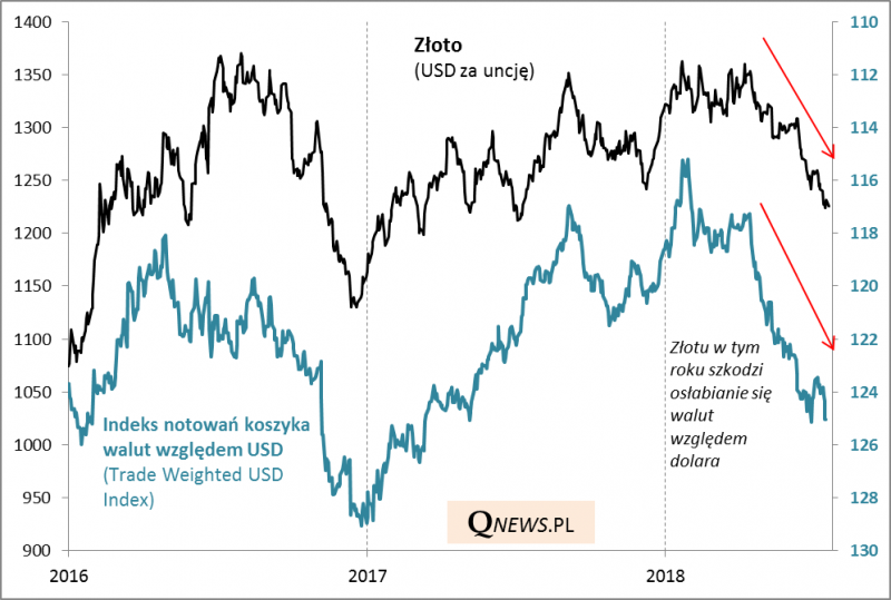 Ostatnie umocnienie dolara amerykańskiego względem innych walut dało się we znaki nie tylko akcjom na rynkach wschodzących, lecz także notowaniom złota (szlachetny metal ze względów historycznych postrzegany bywa jako alternatywa dla dolara - stąd ujemna korelacja między tymi aktywami).