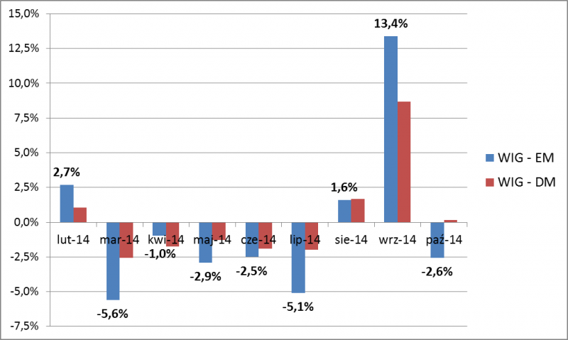 Szczególnie ciekawie wrześniowy wyskok prezentuje się w kontekście międzynarodowym. O ile miesięczny wzrost WIG o 5,8 proc. nie wygląda może szczególnie zaskakująco, biorąc pod uwagę historyczną zmienność naszego rodzimego indeksu, ale kiedy weźmiemy pod uwagę fakt, że indeksy światowe zakończyły wrzesień na niemałych minusach, to sprawa zaczyna wyglądać intrygująco. Renomowany wskaźnik rynków wschodzących, MSCI Emerging Markets (w dalszej części artykułu będziemy używać skrótu „EM”), spadł o 7,6 proc. i nawet indeks rynków rozwiniętych (dalej „DM”) zaliczył zniżkę o 2,9 proc. Oznacza to, że we wrześniu zmiana WIG była aż o 13,4 pkt. proc. lepsza od zmiany EM i o 8,7 pkt. proc. lepsza od zmiany DM. Jeśli spojrzymy na dane historyczne, to okazuje się, że tak dużych różnic w stopach zwrotu na korzyść naszego lokalnego rynku nie było co najmniej od czterech lat. Jedynym zbliżonym przypadkiem był maj 2013 r. (+11,2 pkt. proc. względem EM i +8,5 pkt. proc. względem DM). W minionym miesiącu mieliśmy zatem do czynienia z czymś absolutnie wyjątkowym.