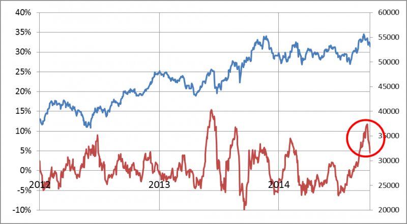Rys. 2. WIG (skala prawa) i różnica 20-sesyjnych stóp zwrotu względem rynków wschodzących