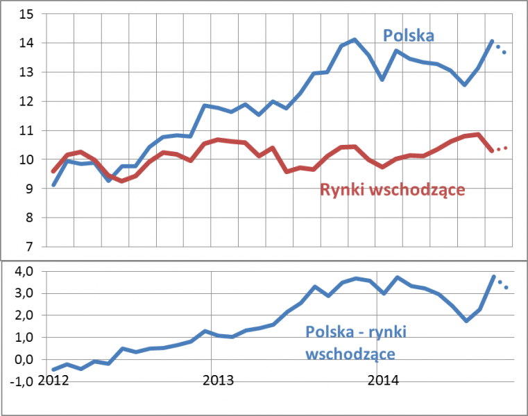 Na sprawę warto spojrzeć nie tylko przez pryzmat zmian indeksów, ale także przez pryzmat wycen na poszczególnych rynkach. Tutaj z pomocą przychodzą publikowane co miesiąc wskaźniki cena/prognozowane zyski spółek (P/E) dla indeksów MSCI. Jak pokazują najnowsze dane, wskaźnik P/E w przypadku naszego rodzimego rynku podskoczył we wrześniu do poziomu maksimum z listopada 2013 r. (14,1 dla MSCI Poland – z naszego doświadczenia wynika, że można to traktować także jako przybliżony szacunek dla głównych indeksów GPW, czyli WIG20 i WIG). To jednocześnie poziom najwyższy od ok. pięciu lat. A tymczasem ten sam wskaźnik dla rynków wschodzących spadł (do 10,3). W efekcie mocno otworzyły się „nożyce” między wycenami w Polsce i na EM. Premia w wycenach w gwałtowny sposób powróciła do górnego przedziału wahań z ostatnich kilkunastu miesięcy. Innymi słowy, o ile jeszcze dwa miesiące temu polskie akcje wydawać się mogły relatywnie atrakcyjne, bo były notowane z dość niską premią względem EM, to we wrześniu owa atrakcyjność znikła wraz z silnym wyskokiem notowań spółek takich jak banki.