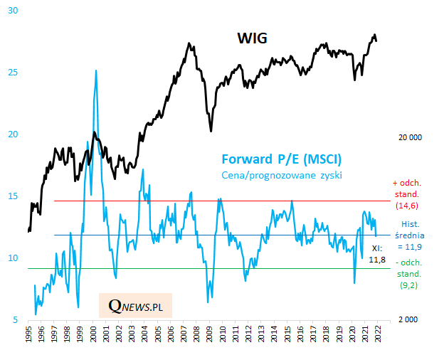 O ile w trakcie pandemicznego krachu w marcu 2020 wskaźnik ten znalazł się na jednym z najniższych poziomów w historii (ok. 8), a ten rok rozpoczynał na pułapie najwyższym od sześciu lat, to obecnie (dane na koniec listopada) jest ... w okolicy historycznej, wieloletniej średniej (11,8).