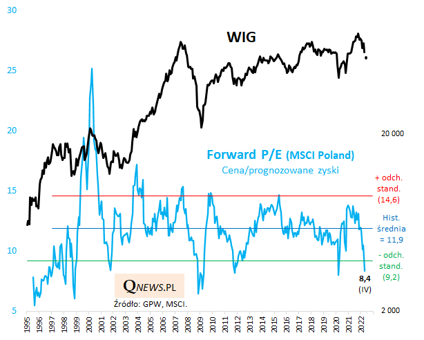 Z udostępnionych właśnie danych MSCI za kwiecień wynika, że wskaźnik ceny do prognozowanych zysków spółek (forward P/E) spadł do 8,4, co jest wartością najniższą od covidowego krachu w marcu 2020 (8,0).