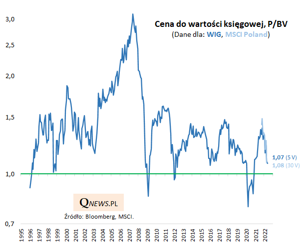 Reasumując, mix negatywnych czynników, o których ostrzegamy od miesięcy, konsekwentnie spycha wyceny akcji na GPW. Wskaźnik P/E sugeruje, że już teraz mamy do czynienia z okazyjnymi poziomami, aczkolwiek mniej podatny na cykliczne wahania zysków spółek współczynnik P/BV nie prowadzi jeszcze do tak entuzjastycznej oceny.