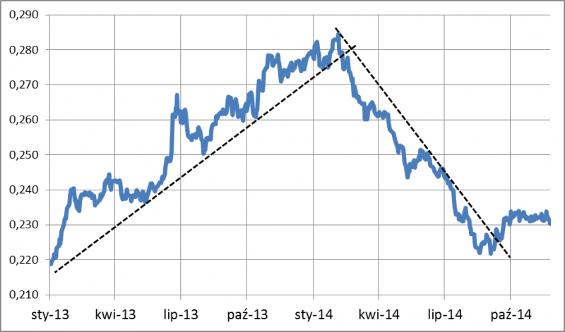 Przez większość tego roku w dół podążał nie tylko indeks małych spółek (jako benchmark do rozważań przyjmujemy MiS80, czyli tymczasowy „zamiennik” dla sWIG80, który ma być reaktywowany w przyszłym roku i zastąpić WIG250). W dół szedł także wskaźnik siły relatywnej względem zdominowanego przez duże spółki WIG. Od września obserwujemy tu jednak pozytywne przemiany. Ostatnio kursy „maluchów” poruszają się w zaskakującej synchronizacji z głównym indeksem GPW. Warto jednocześnie zwrócić uwagę na zrównanie się dwuletnich stóp zwrotu. Rzecz w tym, że niemal cała nadwyżka w stopach zwrotu w porównaniu z WIG, jaką akcje małych spółek wypracowały w bardzo udanym 2013 roku, została już zniwelowana w tym roku. Innymi słowy można by uznać, że wracamy do punktu wyjścia sprzed ubiegłorocznej „hossy maluchów”.