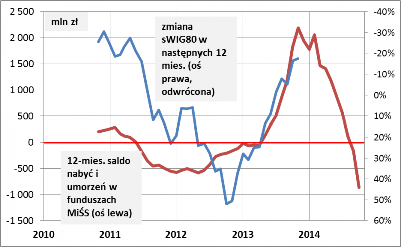 Od początku roku do października z funduszy inwestycyjnych małych i średnich spółek odpłynęła netto kwota 1 mld zł (saldo nabyć i umorzeń). To oznacza, że została zniwelowana ponad połowa napływów netto z 2013 roku. Na pierwszy rzut oka mogłoby się wydawać, że jest to zła wiadomość, ale rynkowa rzeczywistość bywa przewrotna. Postanowiliśmy zbadać co historycznie działo się z sWIG80 w zależności od tego jakie było saldo napływów i umorzeń w funduszach „misiów” w poprzednich 12 miesiącach. Wyniki okazują się bardzo interesujące (bazują niestety na dość krótkiej historii danych sięgającej listopada 2010). W przypadku gdy 12-miesięczne saldo było ujemne (czyli więcej klientów wypłacało niż wpłacało pieniądze) później indeks małych spółek zmieniał się w następnych 12 miesiącach średnio o +21%. Z kolei gdy saldo było dodatnie, później indeks zmieniał się średnio o -14%. Innymi słowy historycznie akcje „maluchów” opłacało się kupować po tym, gdy w poprzednim roku inwestorzy detaliczni pozbywali się tych walorów.