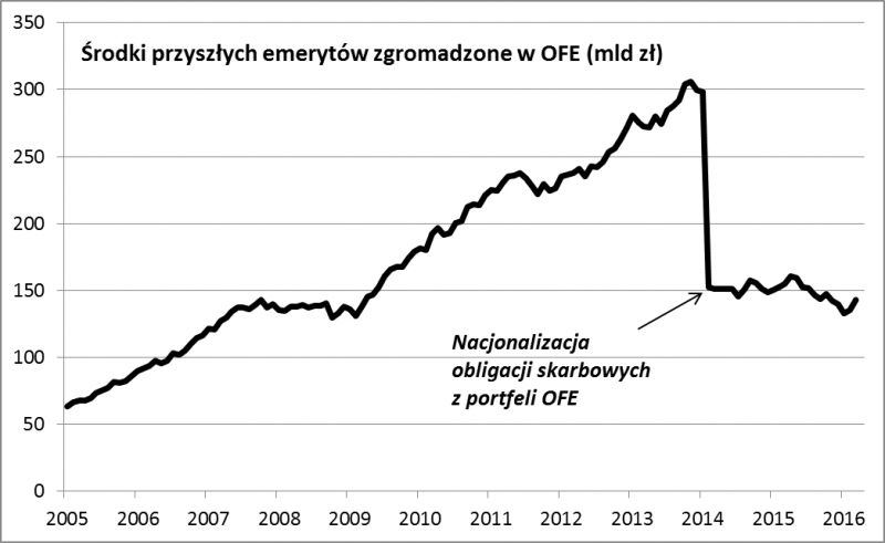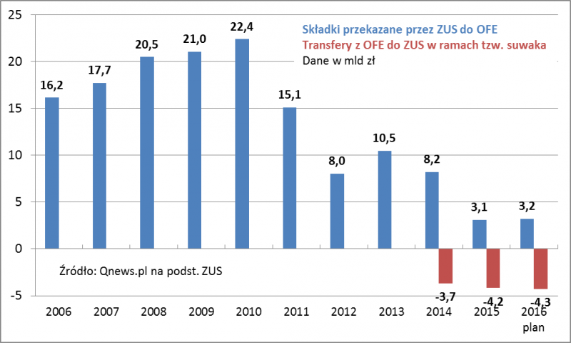 Jak widać strumienie pieniędzy przekazywanych przez ZUS do OFE są obecnie dużo mniejsze, niż było to wcześniej (szczególnie w latach 2008-2010). Stało się tak najpierw na skutek ograniczenia części składek przynależnych drugiemu filarowi (w 2011 r. spadły z 7,3% do 2,3%), a potem (2014) w wyniku całkowitego wycofania składek części ubezpieczonych z OFE (tych, którzy w ramach tzw. dobrowolności nie złożyli oświadczenia w sprawie chęci pozostania w funduszach).