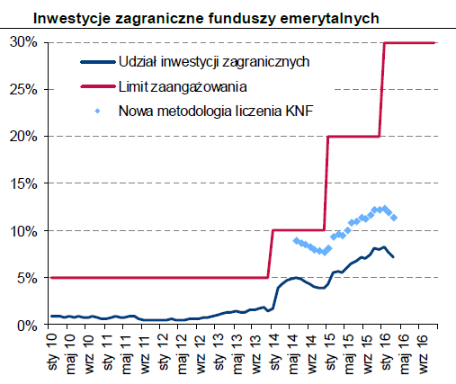 Pozbywanie się polskich akcji przez OFE na przestrzeni ostatnich kilkunastu miesięcy wynikało bardziej z innej zmiany ustawodawczej - stopniowego zwiększenia limitu inwestycji w akcje zagraniczne (wg nowej definicji KNF są to akcje denominowane w walutach obcych). Jak na razie OFE tylko częściowo wykorzystały te nowe możliwości. Jest to więc ciągle pewne ryzyko z punktu widzenia inwestorów na GPW.