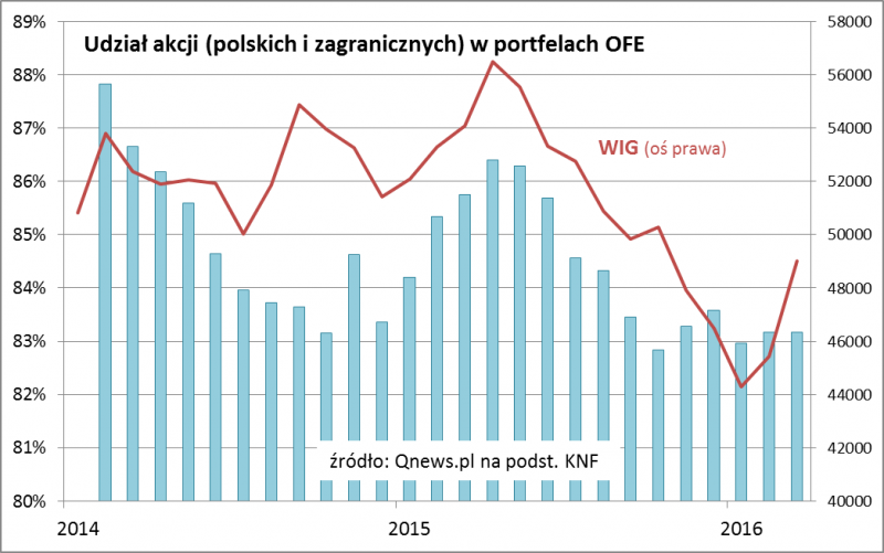 Na koniec trzeba zastrzec, że powyższe pięć faktów dotyczy obecnego stanu prawnego. W ubiegłym roku, wraz ze zmianami politycznymi, wśród inwestorów pojawił się strach, że na tym nie koniec "demontażu" OFE i że w kolejnych latach zostaną one całkowicie zlikwidowane. Naszym zdaniem taki scenariusz będzie uzależniony przede wszystkim od kondycji finansów publicznych (regularnie na Qnews.pl piszemy o wielkości i tempie wzrostu zadłużenia). Gdyby do nacjonalizacji akcji z portfeli OFE faktycznie prędzej czy później doszło, to raczej mało prawdopodobna byłaby nagła masowa ich wyprzedaż przez Skarb Państwa/ZUS - bardziej prawdopodobne byłoby czerpanie bieżących dochodów z dywidend.