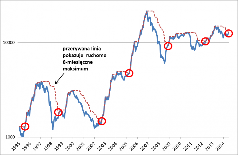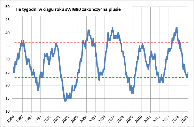 Codzienny „szum informacyjny” (wydarzenia na Ukrainie, negocjacje Grecji z wierzycielami, itp.) sprawia, że łatwo stracić z pola widzenia szerszy obraz sytuacji. A obraz ten jest taki, że indeks małych spółek coraz śmielej kontynuuje trend wzrostowy. Od czasu ustanowienia twardego dna minęło już pół roku, a jednocześnie indeks znalazł się na poziomie najwyższym od ok. ośmiu miesięcy. Postanowiliśmy zbadać, co tego rodzaju sygnał zapowiadał w przeszłości. Ogólnie wniosek jest taki, że w każdym przypadku wskaźnik później dalej rósł (oczywiście z ewentualnymi korektami po drodze), przy czym zasięg tej zwyżki w ostatnich latach był mniejszy niż w bardziej „zamierzchłej” przeszłości. Najmniej korzystnie wyglądał bieg wydarzeń wówczas, gdy sWIG osiągnął 8-miesięczne maksimum po gwałtownej zwyżce (lata 2009 i 1998). Pod tym względem obecna sytuacja prezentuje się lepiej, bo nie mieliśmy jeszcze fali gwałtownej zwyżki, lecz raczej ruch na zasadzie „kroczek po kroczku”.