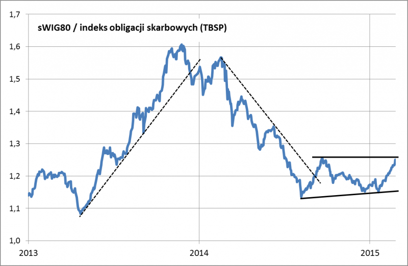 Jednym z głównych konkurentów, nie tylko dla małych spółek ale rynku akcji jako całości, są obligacje skarbowe (fundusze obligacji). Obecnie historyczne, dwunastomiesięczne stopy zwrotu ciągle przekraczają tu +10 proc. Obligacje mają za sobą wzrost cen spowodowany przez spadek stóp procentowych (tematowi temu poświęciliśmy już kilka analiz). W minionym roku ta klasa aktywów okazała się w efekcie hitem inwestycyjnym. Teraz jednak relacje z ubiegłego roku ulegają stopniowemu odwróceniu. Wskaźnik siły relatywnej sWIG80 względem koszyka obligacji o stałym kuponie (indeks TBSP), który w minionym roku zaliczył ostry zjazd, obecnie dla odmiany buduje zachęcającą formację wyglądającą na próbę zmiany trendu spadkowego na wzrostowy. Zauważmy, że akcje „maluchów” wyraźnie wygrały rywalizację z obligacjami np. w II połowie 2013 roku – obecne uwarunkowania przypominają tamtą sytuację.