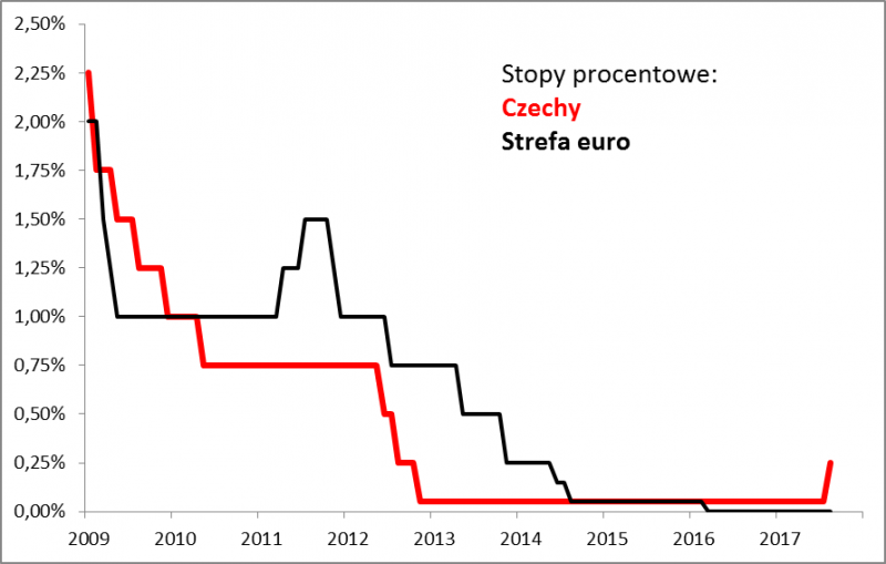 Podczas, gdy w USA trwa cykl podwyżek stóp procentowych, to w Europie generalnie stopy tkwią na bardzo niskich poziomach, a banki centralne z EBC na czele raczej nie palą się do ich podnoszenia. Wczoraj pojawił się jednak pierwszy ważny wyjątek - Czechy. Tamtejszy bank centralny podniósł koszt pieniądza po raz pierwszy od pięciu lat. Nawet po podwyżce główna stopa procentowa pozostaje na bardzo niskim pułapie (0,25%), ale mamy wydarzenie o dość symbolicznym charakterze, być może zwiastun nowego trendu w najbliższych latach w innych europejskich krajach.