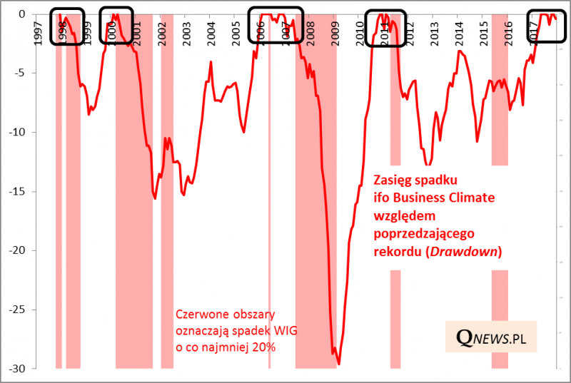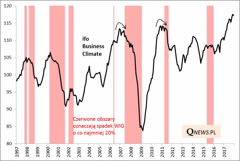 Wielkość spadku nie jest póki co duża i indeks mógłby z łatwością odrobić te straty, ale warto zacząć uważnie obserwować czy ta zadyszka nie przerodzi się w coś większego. Jak bowiem pokazujemy na wykresie, stopniowa zmiana trendu ifo na spadkowy sygnalizowała dobry moment do "ewakuacji" w roku 2011 (przed pamiętnym letnim krachem) oraz w 2007 (przed rozpoczęciem wielomiesięcznej bessy).