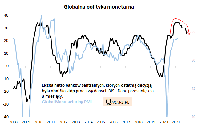 Wg tej koncepcji mniej więcej właśnie teraz obserwujemy szczyt globalnego wskaźnika PMI (czyli najbardziej rozgrzaną koniunkturę), zaś im bliżej końca roku, tym impet w gospodarkach może słabnąć. Oczywiście nie jest to model perfekcyjny, bo np. nie przewidział pandemicznego krachu rok temu, ale daje pewną ogólną orientację co do trendów i efektów polityki banków centralnych.