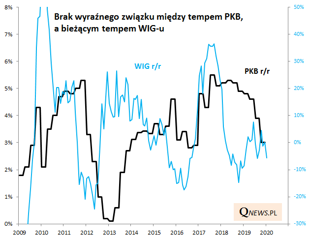 Byłaby to bez wątpienia zła wiadomość, gdyby dynamika PKB mniej więcej pokrywała się z dynamiką giełdowego indeksu. W rzeczywistości, szczególnie po globalnym kryzysie (2009), relacja wydaje się mało klarowna. Zauważmy, że dynamika WIG-u ostro zjechała w dół już na przestrzeni 2018 roku, czyli zanim jeszcze ekonomiści zdołali dostrzec na horyzoncie spowolnienie gospodarcze (wręcz przeciwnie, dominowały wtedy raczej bardzo optymistyczne opinie).