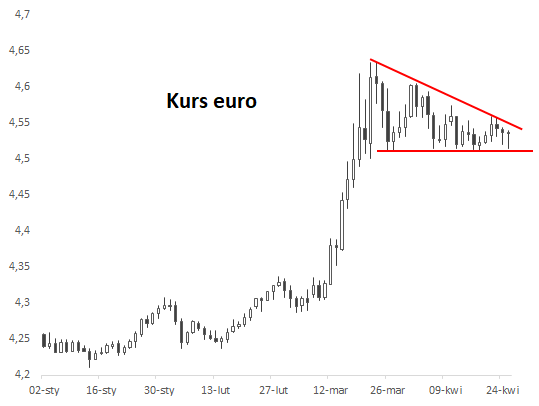 O ile w trakcie marcowej paniki na rynkach doszło do wyraźnego osłabienia polskiej waluty, to od mniej więcej miesiąca kurs PLN stabilizuje się, zarówno względem euro (wykres poniżej), jak i innych głównych walut. W przypadku EUR/PLN mamy do czynienia z wyraźnym technicznym poziomem wsparcia (ok. 4,51). Jego przełamanie mogłoby zwiastować falę osłabienia EUR (umocnienia PLN). Ale jest też alternatywny scenariusz, w którym stabilizacja notowań mogłaby stanowić jedynie przystanek przed dalszą aprecjacją walut obcych względem PLN.