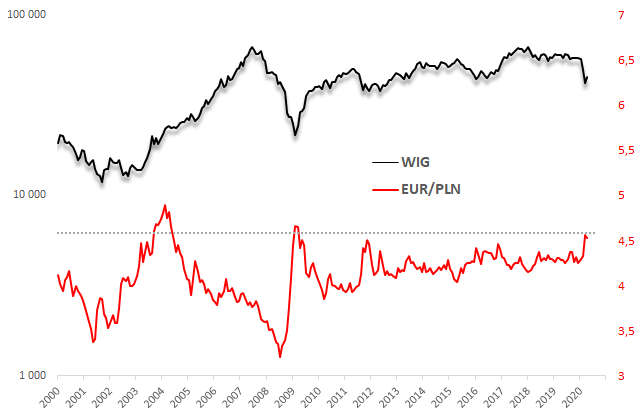 Reasumując, polska waluta od miesiąca stabilizuje się po marcowej panicznej wyprzedaży. Owa wyprzedaż na wzór historycznych wzorców ma swoje plusy (uatrakcyjnienie eksportu). PLN jest blisko górnej granicy wieloletniego pasma wahań, więc w średnim terminie potencjał do umocnienia wydaje się większy niż do dalszego osłabienia. Czynniki ryzyka to niepewna sytuacja na rynkach globalnych oraz eksperymentalna polityka monetarna.