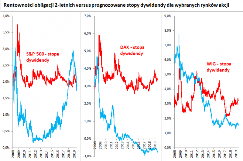 Reasumując, trwający trend spadkowy rentowności obligacji na rynkach bazowych ma swoje jasne i ciemne strony z punktu widzenia inwestorów giełdowych. W scenariuszu pesymistycznym obligacje dyskontują zbliżanie się recesji, choć zdarzało się, że bywały w błędzie w tych prognozach. W scenariuszu bardziej optymistycznym spadek rentowności to mniejsza konkurencja dla akcji, które oferują relatywnie atrakcyjniejsze stopy dywidendy.