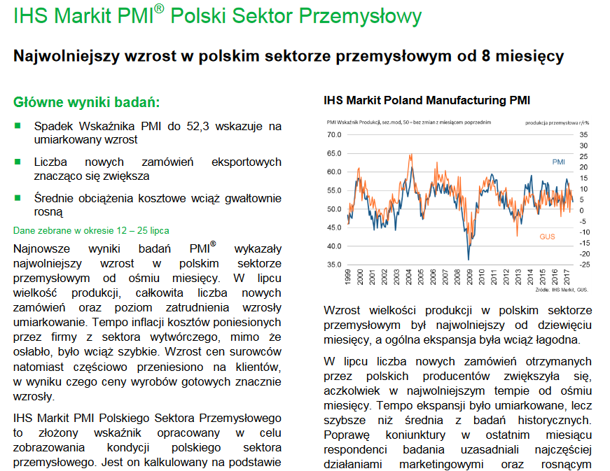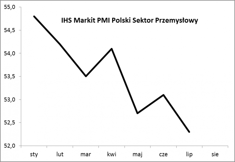 Ledwie zaczęliśmy zastanawiać się nad przyczynami osuwania się indeksu sWIG80 (grupującego głównie małe spółki na GPW), a pojawił się kolejny ważny sygnał. Tym razem z polskiej gospodarki. Powszechnie obserwowany przez analityków i ekonomistów wskaźnik PMI (na podstawie ankiet wśród firm pokazuje poziom aktywności w przemyśle) ustanowił tegoroczne minimum - jest najniżej od listopada ub.r.! Pocieszać się można tym, że jego wartość jest ciągle wysoka (52,3 pkt.), a spadek do ośmiomiesięcznego minimum to zdaniem autorów badania raczej sygnał "przyhamowania tempa wzrostu", a nie tyle początku jakiejś zapaści (dopiero spadek poniżej granicy 50 pkt. uznawany jest za sygnał recesyjny).