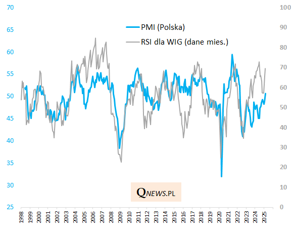 Teoretycznie powrót PMI do ekspansji powinien być również dobrą wiadomością dla krajowego rynku akcji. Średnio rzecz biorąc, WIG rósł o prawie 30 proc. w ciągu półtora roku od momentu zwyżki PMI powyżej wspomnianej granicy.
