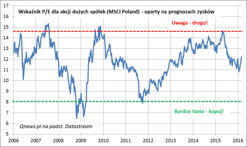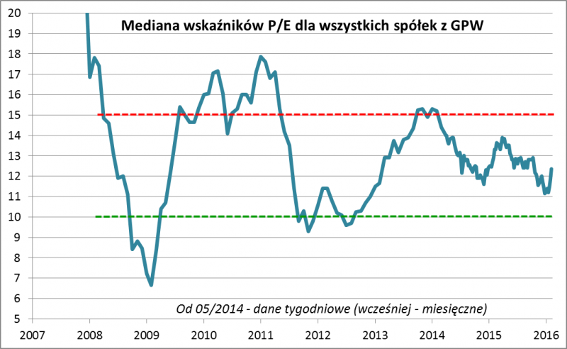 Co ciekawe mimo innej metodologii liczenia wskaźnika i innej, dużo szerszej reprezentacji spółek, aktualne poziomy są niemal identyczne. I w tym przypadku mieliśmy "rajd" P/E z ok. 11,0 do ok. 12,5. To zupełnie przeciętny poziom wycen - na szerokim rynku nie jest ani drogo (P/E > 15 lub jeszcze wyżej), ani też szczególnie tanio (P/E
