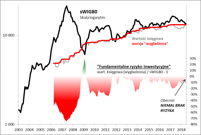 Reasumując, nasz innowacyjny wskaźnik na bazie wartości księgowej pokazuje, jakie w danym momencie jest ryzyko inwestycyjne na GPW z punktu widzenia długoterminowego inwestora. Wskaźnik zachowuje się zgodnie z intuicją – na szczytach hossy pokazywał skrajne ryzyko, a w dołku bessy – praktycznie brak ryzyka. A teraz? Najlepiej wygląda w przypadku małych spółek, które po trwającej od roku przecenie notowane są ze wskaźnikiem ryzyka bliskim zera.