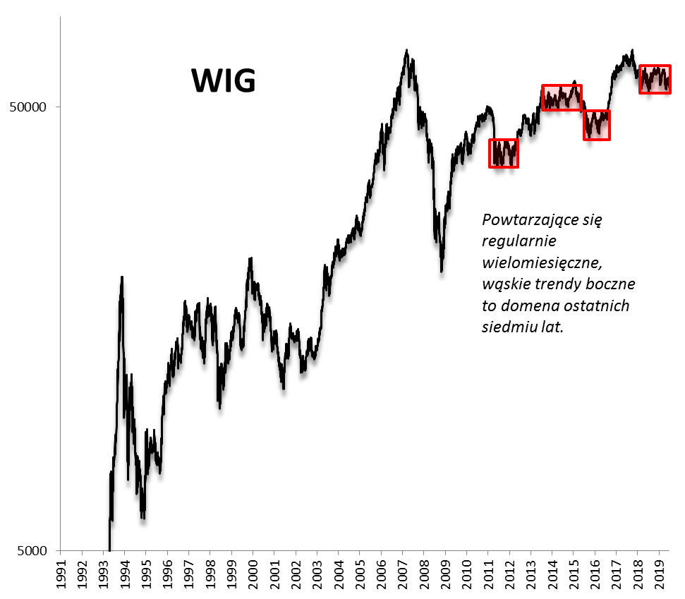 Rys. 1. Wielomiesięczne, wąskie trendy boczne stały się normą na GPW