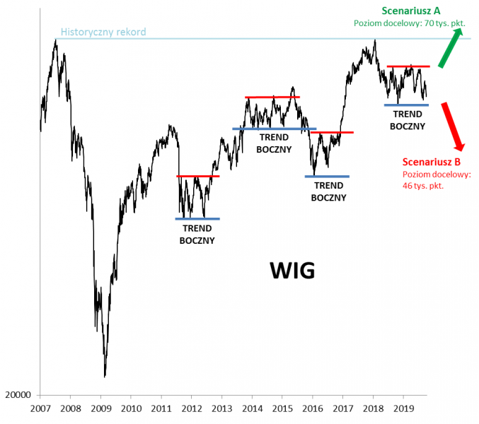 Od kilkunastu miesięcy WIG tkwi w trendzie bocznym, który zgodnie z tradycją powinien zapowiadać mocny i szybki ruch. Pokazujemy kontekst historyczny i zastanawiamy się do jakich poziomów docelowych może w efekcie dotrzeć indeks GPW.