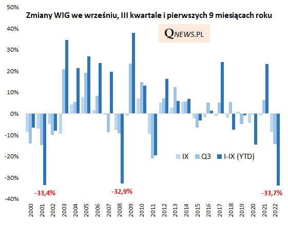 Skala przeceny przywołująca na myśl rok 2008 widoczna jest również w statystykach dotyczących zmian indeksów w całym III kwartale (WIG -14,2%, S&P 500 -5,3%), lub też od początku roku (WIG -33,7%, S&P 500 -24,8%). Obok 2008 roku w tych porównaniach wyróżnia się też inny rok - 2001.