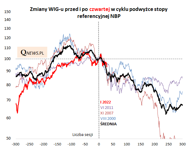 Po pierwsze aktualizacji wymagają nasze rozważania dotyczące podwyżek stóp procentowych przez RPP. Już po styczniowej decyzji Rady wskazywaliśmy, że historycznie czwarta podwyżka stóp niejako "przesądzała" o kierunku trendu na polskim rynku akcji (w tym sensie, że po czwartej podwyżce WIG we wszystkich trzech przypadkach miał przed sobą trend spadkowy). Jak na razie zachowanie WIG-u nie odbiega zbytnio od tamtego historycznego schematu.