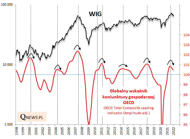 Owe spowolnienie jest też sygnalizowane przez najnowszy odczyt globalnego wskaźnika wyprzedzającego koniunktury OECD (CLI), który znalazł się najniżej od 10. miesięcy. Historycznie regułą było, że po takim spadku z lokalnego szczytu CLI potem nie przestawał spadać, dopóki nie otarł się przynajmniej o granicę 100 pkt. (wobec 100,5 pkt. obecnie).