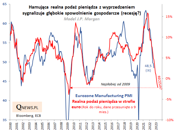 Końcówka miesiąca to dla nas tradycyjnie okazja do odświeżenia narzędzia, które bardzo pomogło nam trafnie ostrzec przed bessą trwającą na GPW od jesieni ub.r. Chodzi o koncepcję, zgodnie z którą wahania realnej podaży pieniądza w bliskiej nam handlowo strefie euro decydują z wyprzedzeniem o kierunku zmian wskaźników koniunktury gospodarczej takich jak PMI, co z kolei pośrednio przekłada się na koniunkturę giełdową.