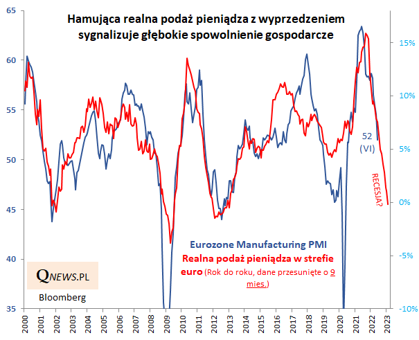 Dlaczego sygnały te są godne uwagi? Bo zachowanie realnej podaży pieniądza z wyprzedzeniem informuje o tym, co będzie się działo w gospodarkach. Do takiego przynajmniej wniosku prowadzi przedstawiona na poniższym wykresie zależność, którą przed laty zapożyczyliśmy z analiz J.P. Morgan, i która cały czas przynosi niezwykle trafne sygnały. O pierwszych niepokojących symptomach pisaliśmy jeszcze na jesieni 2021.